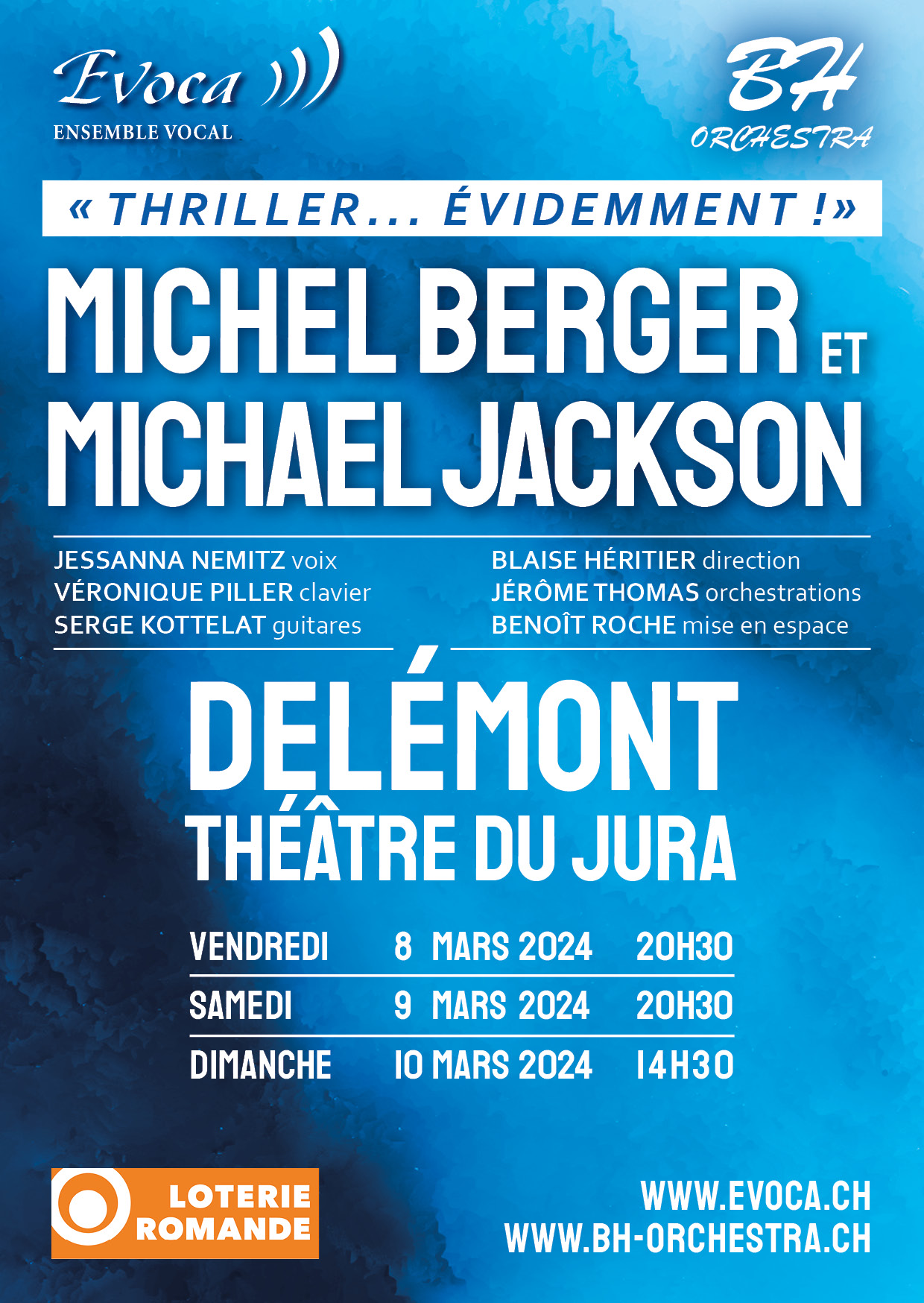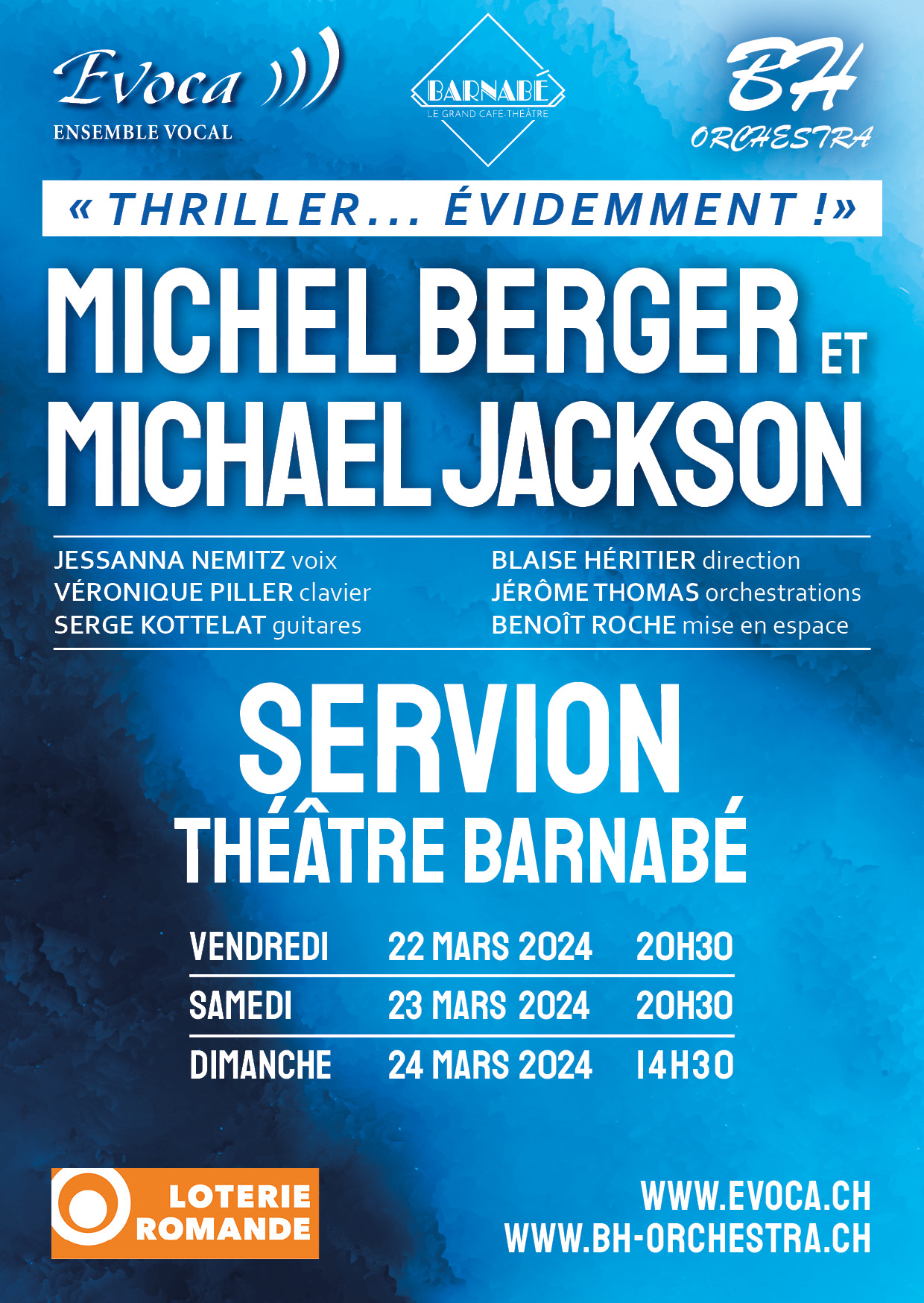 L’ensemble vocal EVOCA et le BH Orchestra présentent une nouvelle rencontre « en miroirs » aussi improbable que délirante MICHEL BERGER & MICHAEL JACKSON Avec : JESSANNA NEMITZ, voix // VERONIQUE PILLER, claviers // SERGE KOTTELAT, guitares // BLAISE HERITIER, direction